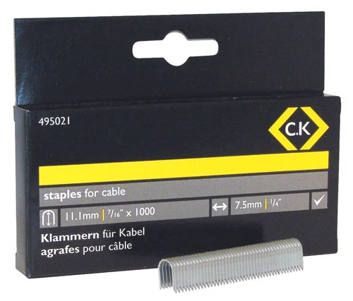 Be the first to review “C.K Cable Staples 7.5mm Wide X 11.1mm Deep Box Of 1000 495021” Cancel reply