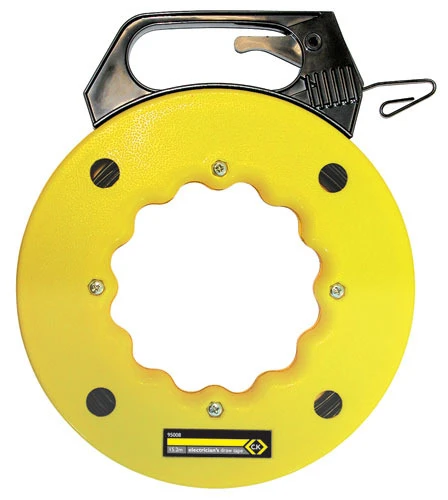 Ideal for drawing electrical wiring through conduit. Manufactured from high strength flexible spring steel with a hooked end to avoid snagging in use. Housed in a sturdy rotating plastic storage case with brake. Trigger mechanism in handle.