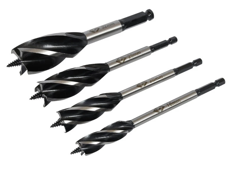 4 blades offering faster waste removal and 100% more cutting blade than a flat or auger bit. Cutting edges ground with spur blades for clean hole profile and breakout. Screw point allows accurate positioning and pulls the bit through with less effort. Class leading cutting speeds. Hex drive shaft with fast change docking facility.