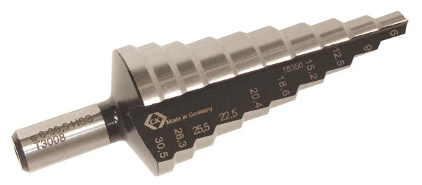 Centres, drills and de-burrs thin sheet metal in one operation. Manufactured from HSS for long lasting performance. Dual flute construction for reduced drilling pressure, faster drilling and longer tool life. Self starting tip. Three flats on drive shaft for non slip drive in drill chuck. Cuts hole sizes: 6, 9, 12.5, 15.2, 18.6, 20.4, 22.5, 25.5, 28.3 & 30.5mm (PG7, PG9, PG11, PG13, PG16, M25, PG21),