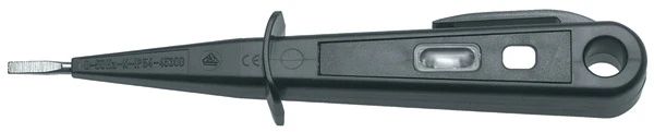 VDE approved mainstester One piece moulded blade and handle, fully insulated for assured safety. Strong black plastic body with an integral pocket clip, hanging hole and anti-slip guard. The bulb is a clear easy to see bright neon. Top quality nickel plated blade DIN 57680-6, DIN VDE 0680-6:1972-04