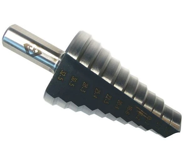 Centres, drills and de-burrs thin sheet metal in one operation. Manufactured from HSS for long lasting performance. Dual flute construction for reduced drilling pressure, faster drilling and longer tool life. Self starting tip. Cuts hole sizes: 12.5, 12.7, 15.2, 16.2, 18.6, 20.4, 22.5, 25.4, 28.3, 30.5 & 32.5mm.