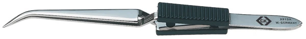 Carbon steel, hardened, polished and fine nickel plated. Reverse action. Soldering tweezers with finger pads to protect against heat. Fine, bent tips, 2.5mm wide.