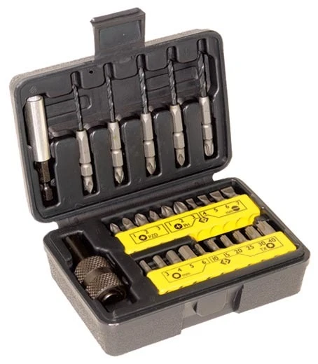 Simple, quick change of drill accessories by click release. Swap from drill to screwdriver bit with out re-chucking, saving time and effort. 3?8? hex shaft. Contents: one each of Quick change Chuck – Bit holder – Bits: Slotted 4, 5, 6, & 7mm, PZ1, 2 & 3. PH1, 2 & 3. Hex 3, 4, 5, 6 & 7mm. TX10, 15, 20, 25, 30 & 40