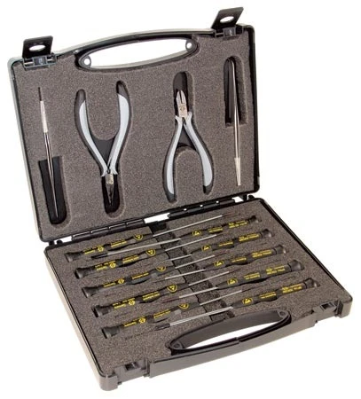 Set of SensoplusESD pliers, Tweezers and Xonic ESD screwdrivers in a tough plastic storage case. Contains: T3772D 120mm Snipenose pliers, T3773D 115mm Sidecutters, T2334 Positioning tweezer, , T2343 Precision tweezer, T4880XESD Slotted screwdriver 1.5×60, 1.8×60, 2.5×60, 2.5×75, 3.0×100, 4.0×100. T4882XESD Philips screwdrivers PH000x60, PH00x60, PH0x60 & PH1x80